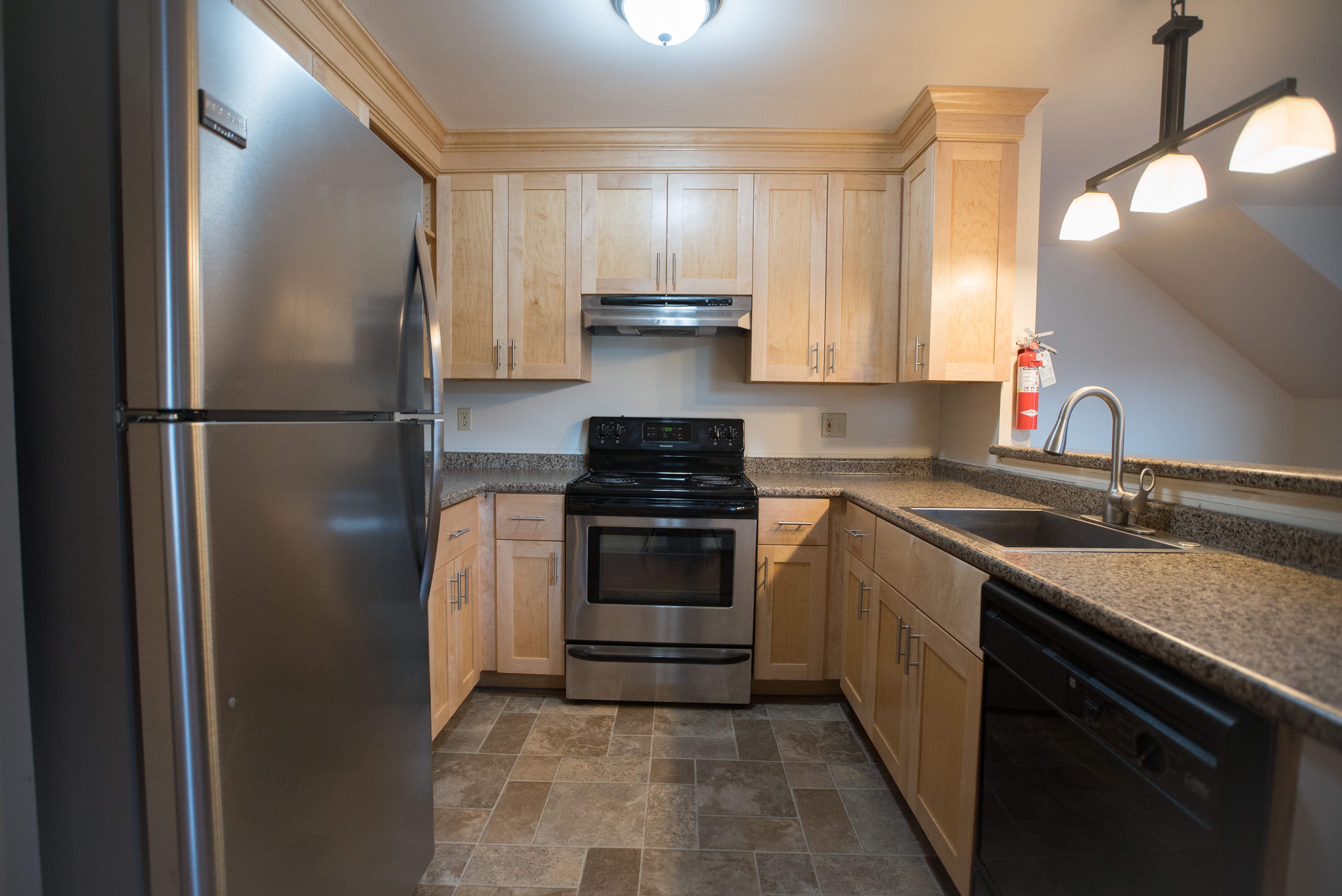 Apartment is large 4 bedroom, 2 level apartment. The entry is on second level of the house which makes it quiet and safe. Kitchen has beautiful custom made maple cabinets, new countertops , sinks , faucets ,dishwasher, electric stove and new fridge. All new American Cherry floors thoughout apartment. Everyone is loving the new kitchen.